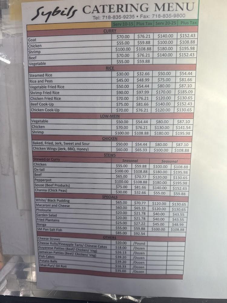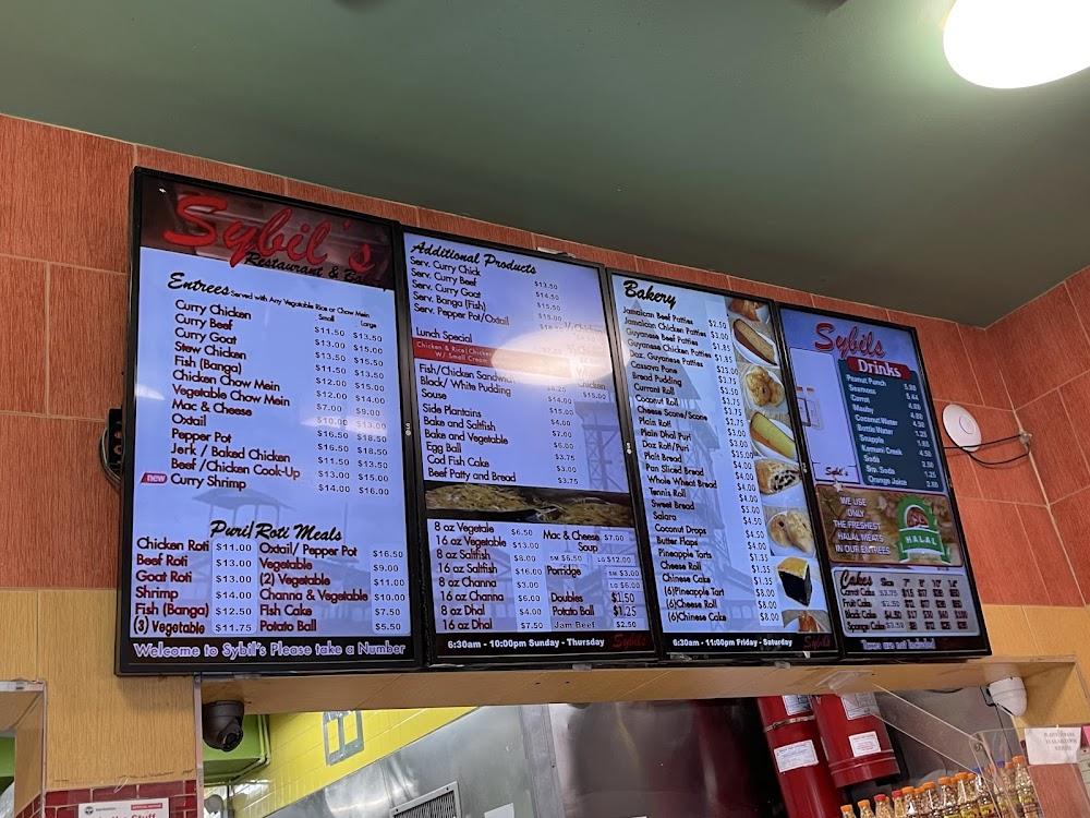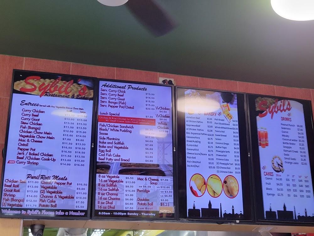 Sybil's menu features an impressive variety of Guyanese culinary delights. The lineup includes curry dishes, rotis, and freshly baked pastries that define the Caribbean dining experience.